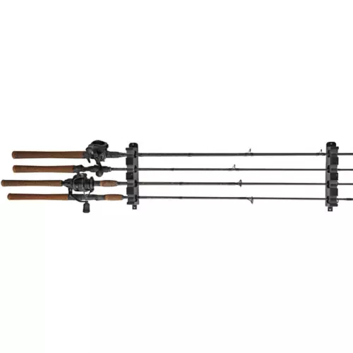 The Berkley® horizontal rod rack saves space while neatly and securely storing up to 4 or 6 complete rod and reel combos. ##Use enclosed screws to attach to wood, metal, fiberglass or plastic. Use suitable wall anchor when applying to sheetrock or wallboard. Spacing between mounts vary depending on gear stored – recommended spacing between mounts is approximately 42″.